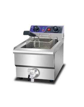 Επαγγελματική φριτέζα ηλεκτρική τριφασική FRYDT10, χωρητικότητας 10lt+10lt και εξωτερικών διαστάσεων 690x540x410mm. Κατασκευή από ανοξείδωτο σώμα, διαθέτει θερμικό ασφαλείας,στρογγυλεμένο κάδο, χρονοδιακόπτη, βρυσάκι απορροής λαδιού και ισχύ 6+6Kw.