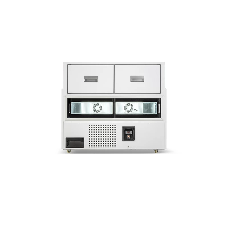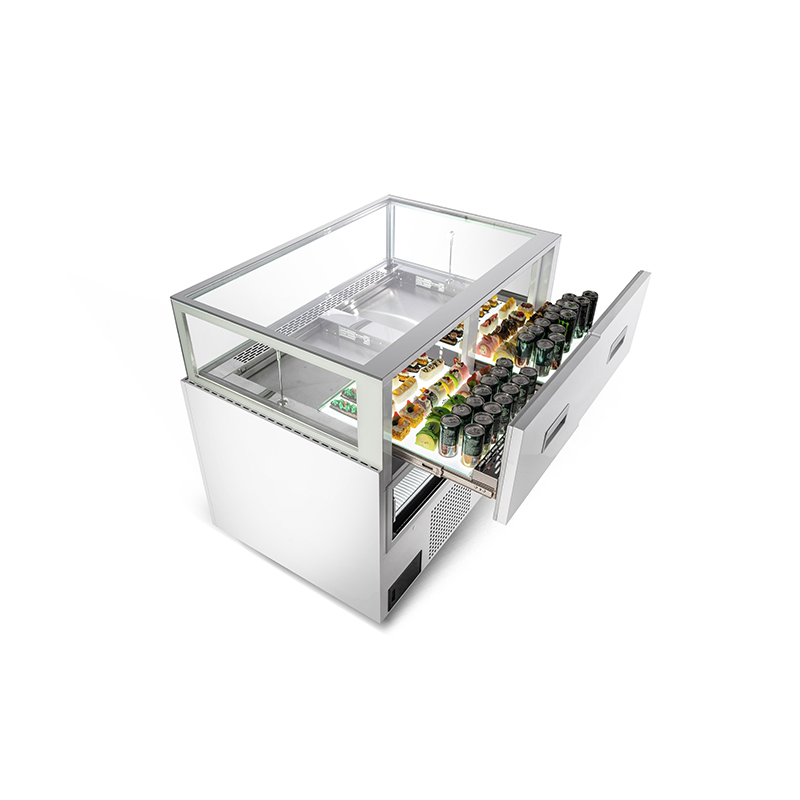 Επαγγελματική ψυχόμενη βιτρίνα κέντρου VCM120C, με ψυχόμενο αποθηκευτικό χώρο στο κάτω μέρος και προβολή συρτάρι στο πάνω μέρος. Διαθέτει φωτισμό Led και ρόδες, καθώς ο χρωματισμός του είναι λευκός. Επιπλέον φέρει σύστημα εξαγωγής ζεστού αέρα στα πλαϊνά και το μπροστινό τζάμι, το οποίο βοηθά στο να αποτρέψει την εμφάνιση υγρασίας.